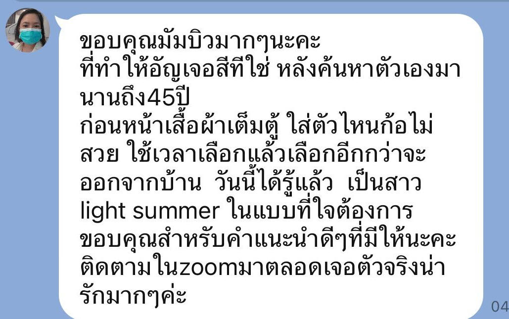 การเดินทางของฉันเริ่มต้นจากการช่วยให้ผู้คนมีสุขภาพดีขึ้นฉันได้ช่วยให้คนมากกว่า 1,000 คนประสบความสำเร็จในการลดน้ำหนัก แต่ฉันค้นพบว่า ความมั่นใจที่แท้จริงไม่ได้อยู่แค่การมีรูปร่างผอมเพรียว แต่มันคือการรู้สึกว่าสวยจากภายในสู่ภายนอกสิ่งนี้เป็นแรงบันดาลใจให้ฉันกลายมาเป็น Colorist โดยใช้ Personal Color Analysis เพื่อช่วยให้ผู้คนค้นพบความงามในแบบของตัวเอง จนถึงตอนนี้ ฉันได้วิเคราะห์สีให้กับผู้คนกว่า 700 คนทั่วประเทศไทย และถ่ายทอดความรู้ให้กับผู้ที่ต้องการเป็น Colorist จำนวน 25 คน ซึ่งได้นำความรู้นี้ไปช่วยเหลือผู้อื่นต่อไปสำหรับฉัน สไตล์และสีไม่ใช่แค่เรื่องของแฟชั่น แต่มันคือวิธีการแสดงตัวตนของคุณ เมื่อคุณค้นพบสีของตัวเอง คุณไม่ได้แค่แต่งตัวสวย แต่คุณกำลังเล่าเรื่องราวของคุณให้โลกรู้ มาค้นหาสีที่ช่วยเผยความงามในแบบที่เป็นตัวคุณ และถ่ายทอดความเป็นตัวเองได้อย่างงดงามและมั่นใจไปด้วยกัน